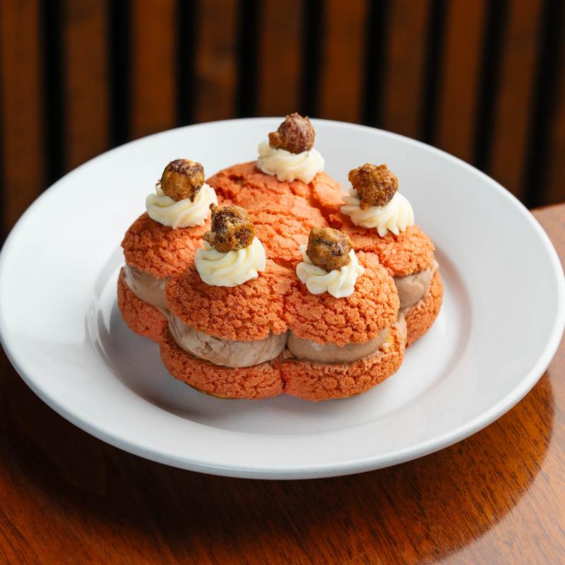 Espresso-soaked Pan de Muerto bread topped with candied pecans, Baharat whipped cream, and brown butter maple syrup
