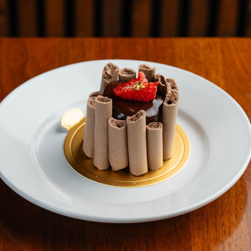 Pate de choux filled with chocolate hazelnut mousse, hazelnut praline, chocolate-covered feuilletine, topped with candied hazelnut *nut allergy