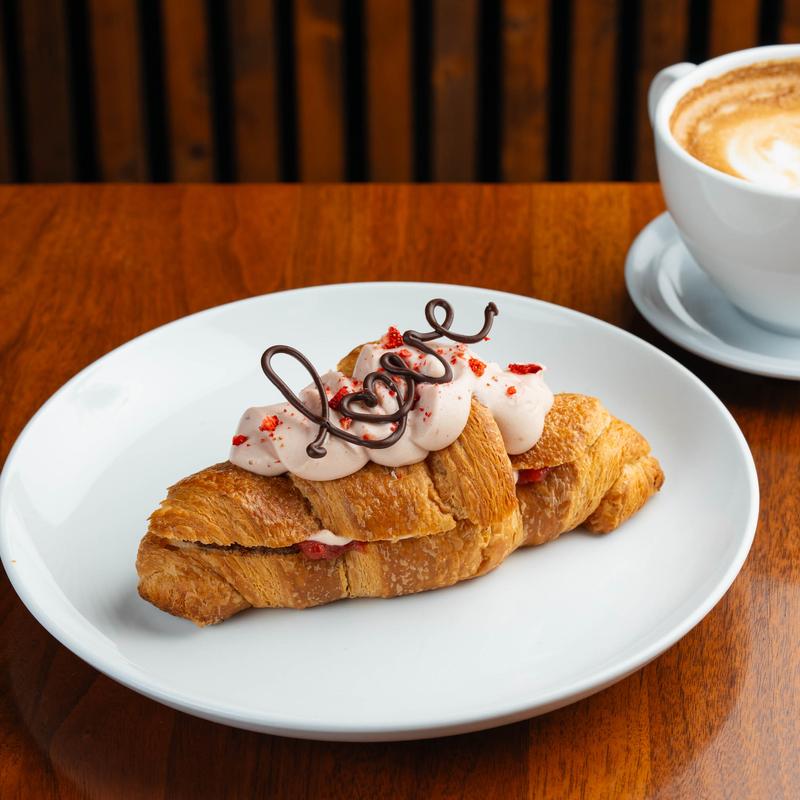 Twice baked croissant with chocolate frangipane filled with strawberry guava jam & strawberry diplomat cream, topped with a chocolate LOVE garnish *nut allergy